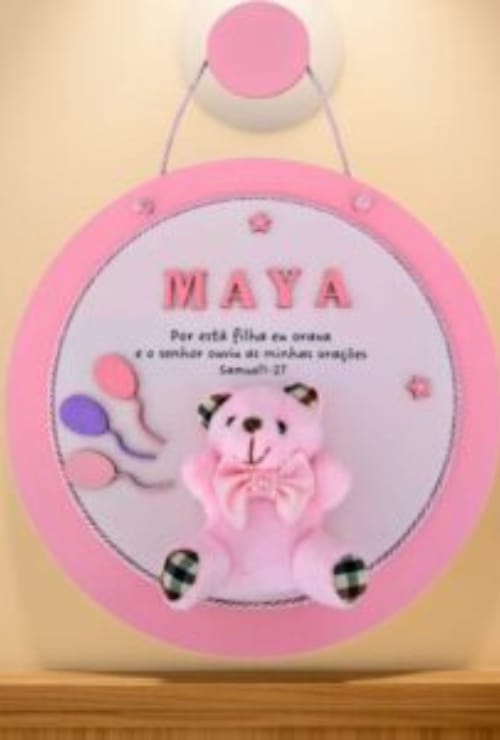 Produto feito em 2 placas de MDF de 3mm cada, uma com 25cm de diâmetro, sobre posta, a placa de 25cm pintada a mão com tinta atóxica, a placa de 20cm adesivada com papel fotográfico de alta qualidade, alguns itens em alto relevo. Como o nome do bebê por exemplo acompanha o pendurados em MDF, e cordão decorativo. É um produto personalizado e exclusivo nos detalhes.