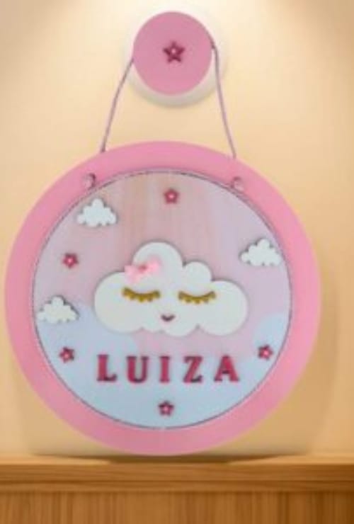 Produto feito em 2 placas de MDF de 3mm cada, uma com 25cm de diâmetro, sobre posta, a placa de 25cm pintada a mão com tinta atóxica, a placa de 20cm adesivada com papel fotográfico de alta qualidade, alguns itens em alto relevo. Como o nome do bebê por exemplo acompanha o pendurados em MDF, e cordão decorativo. É um produto personalizado e exclusivo nos detalhes.