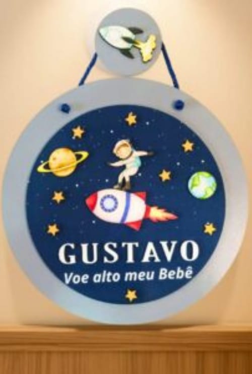 Produto feito em 2 placas de MDF de 3mm cada, uma com 25cm de diâmetro, sobre posta, a placa de 25cm pintada a mão com tinta atóxica, a placa de 20cm adesivada com papel fotográfico de alta qualidade, alguns itens em alto relevo. Como o nome do bebê por exemplo acompanha o pendurados em MDF, e cordão decorativo. É um produto personalizado e exclusivo nos detalhes.
